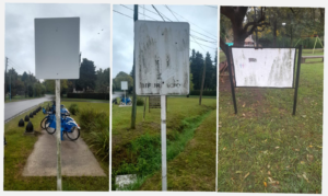 Los letreros habían sido colocados en una de las zonas más postergadas del barrio, en calles como Kennedy, Tintoretto y Tiziano, donde el estado de las calles es crítico. Allí fueron detectados por funcionarios municipales, que actuaron con celeridad para quitarlos. Lamentablemente, no ocurrió lo mismo, con carteles oficiales (ver foto) que llevan años despintados en las cercanías de esa misma zona.